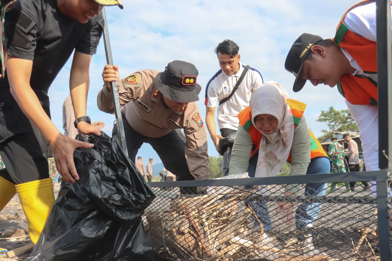 Sejak pagi, personel Polres Lumajang Polda Jatim bersama instansi lintas sektor dan masyarakat setempat tampak bahu-membahu membersihkan sampah di sepanjang pesisir pantai.